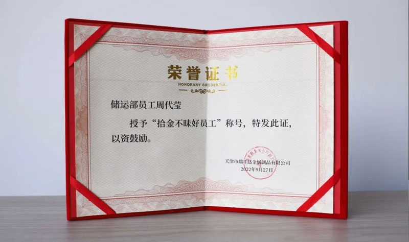 弘揚(yáng)傳統(tǒng)美德,樹(shù)立時(shí)代新風(fēng),拾金不昧的行為雖然普通,但卻充滿(mǎn)了正能量。讓人們感受到美德的可貴。天津市瑞豐達(dá)金屬制品有限公司注重員工精神文明建設(shè),大力弘揚(yáng)中華傳統(tǒng)文化及美德,學(xué)習(xí)先進(jìn)典型,用榜樣的力量深入引導(dǎo)員工將文明道德與職業(yè)操守緊密結(jié)合,切實(shí)的做到內(nèi)化于心、外表于行。